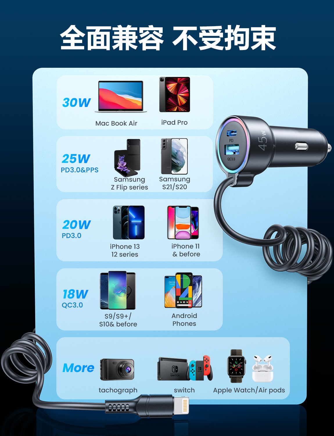 - 智能電流識別:內置智能識別芯片,能根據設備需求合理分配電流,保護手機和車輛的安全