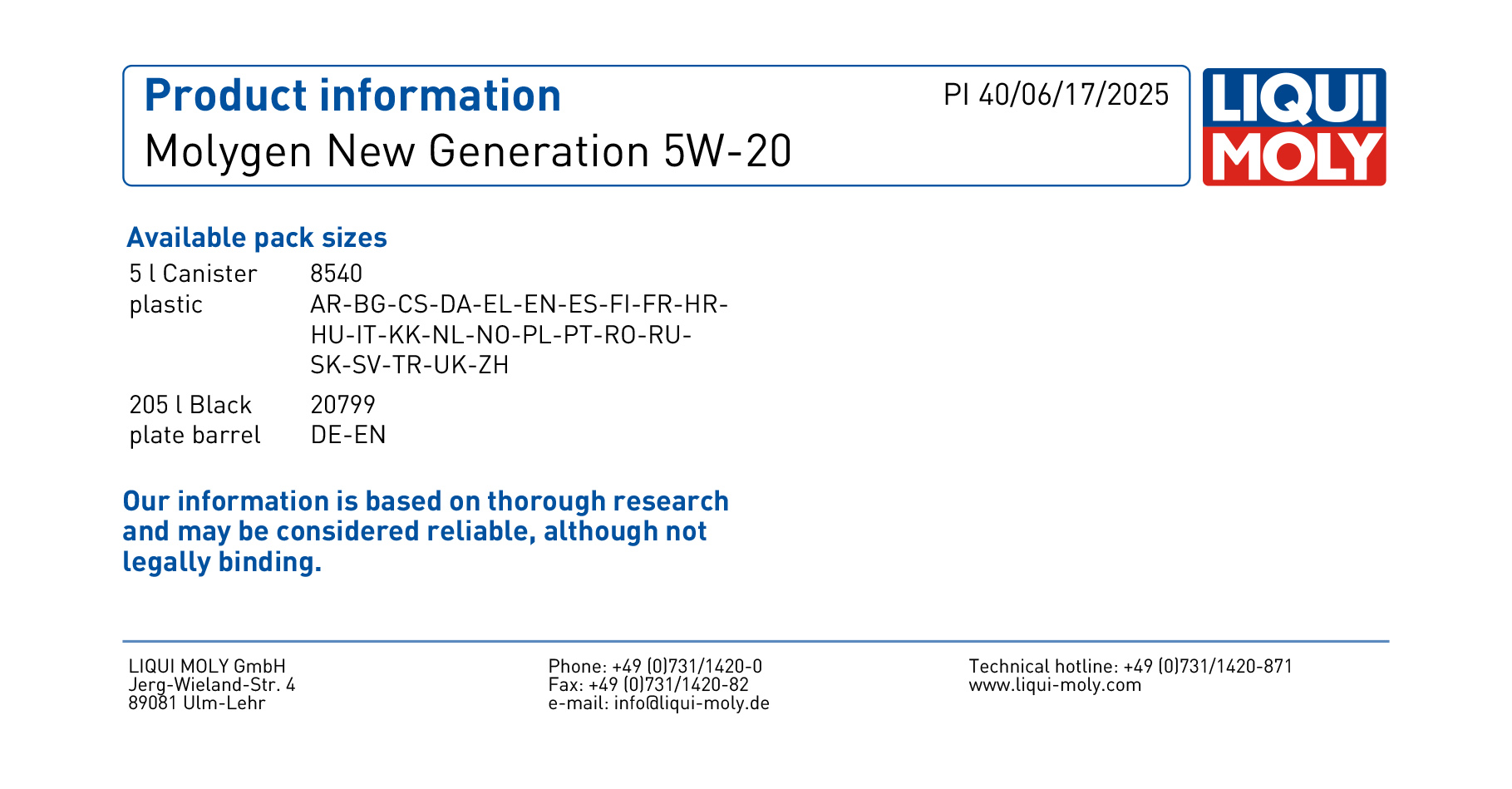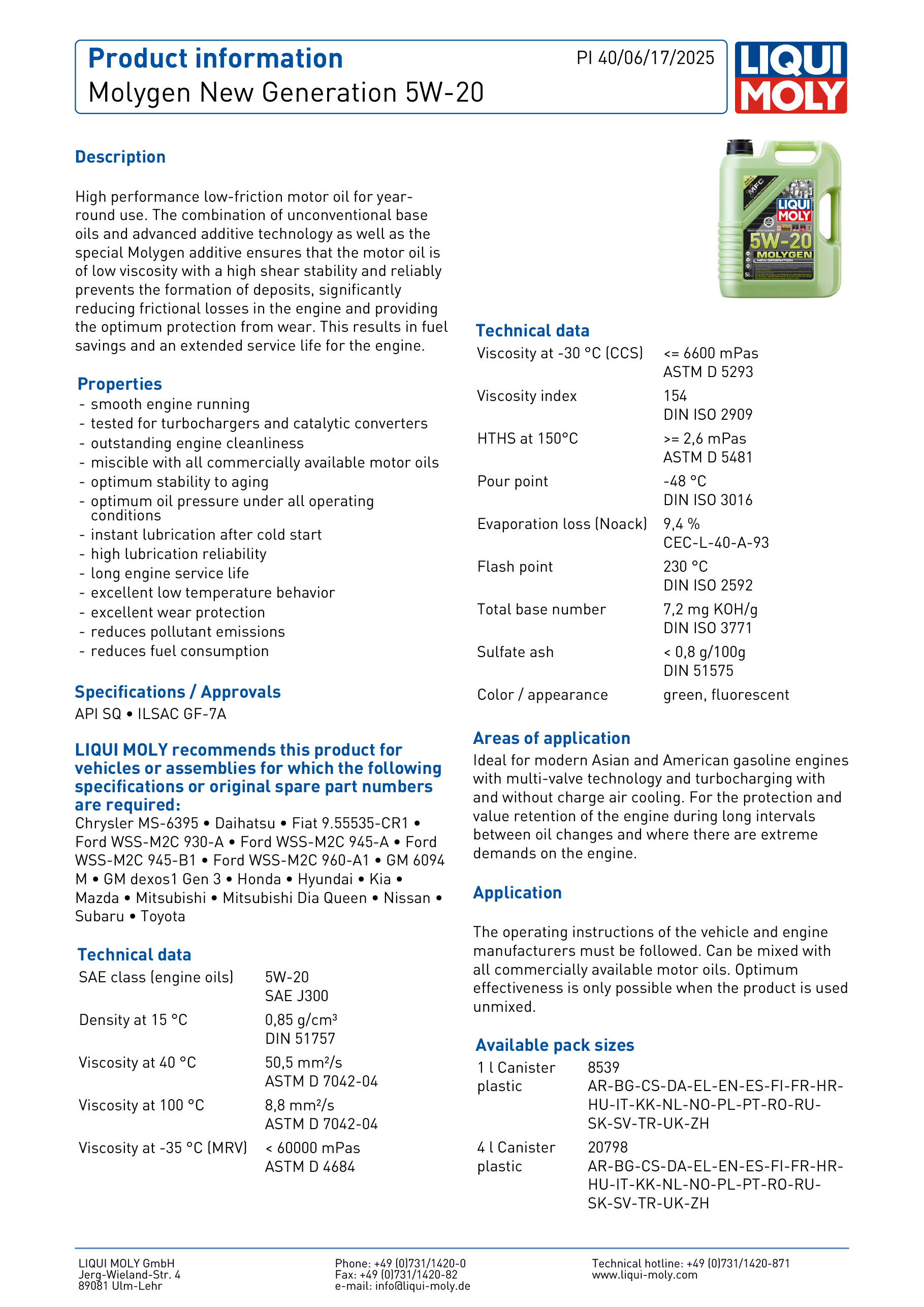 LIQUI MOLY Molygen New Generation 5W-20 機油/潤滑油/偈油【綠魔系列】【原裝行貨】