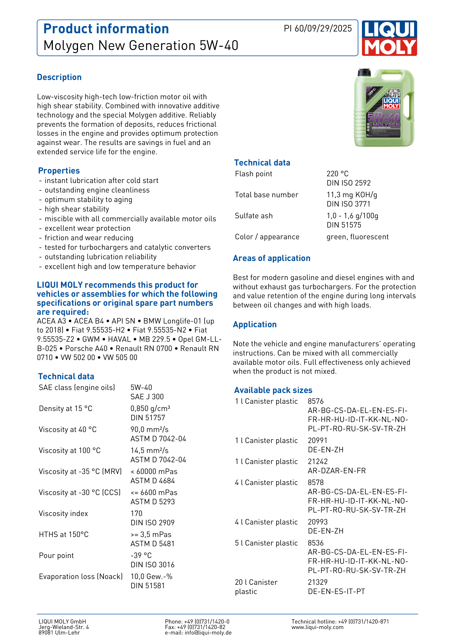 Molygen 新一代 5W-40 低粘度、高科技、低摩擦機油,具有高剪切穩定性。結合創新的添加劑技術和特殊的 Molygen 添加劑。可靠地防止沉積物的形成,減少發動機中的摩擦損失,並提供最佳的耐磨保護。其結果是燃油節省和發動機使用壽命延長。 最適合現代汽油和柴油發動機,無論是否配備廢氣渦輪增壓器。可在更換機油的長間隔期間及高負荷情況下保護發動機並保持其價值。【綠魔系列】【香港原裝正貨】 黏度: 5W-40 標準 / 認證: ACEA A3, ACEA B4, API SN 建議車輛規格: BMW Longlife-01 (up to 2018), Fiat 9.55535-H2, Fiat 9.55535-N2, Fiat 9.55535-Z2, GWM, HAVAL, MB 229.5, Opel GM-LL-B-025, Porsche A40, Renault RN 0700, Renault RN 0710, VW 502 00, VW 505 00 產品編號:8536 產品容量:5 LIT 裝箱單位:4支 X 5 LIT/ 箱 產地:德國