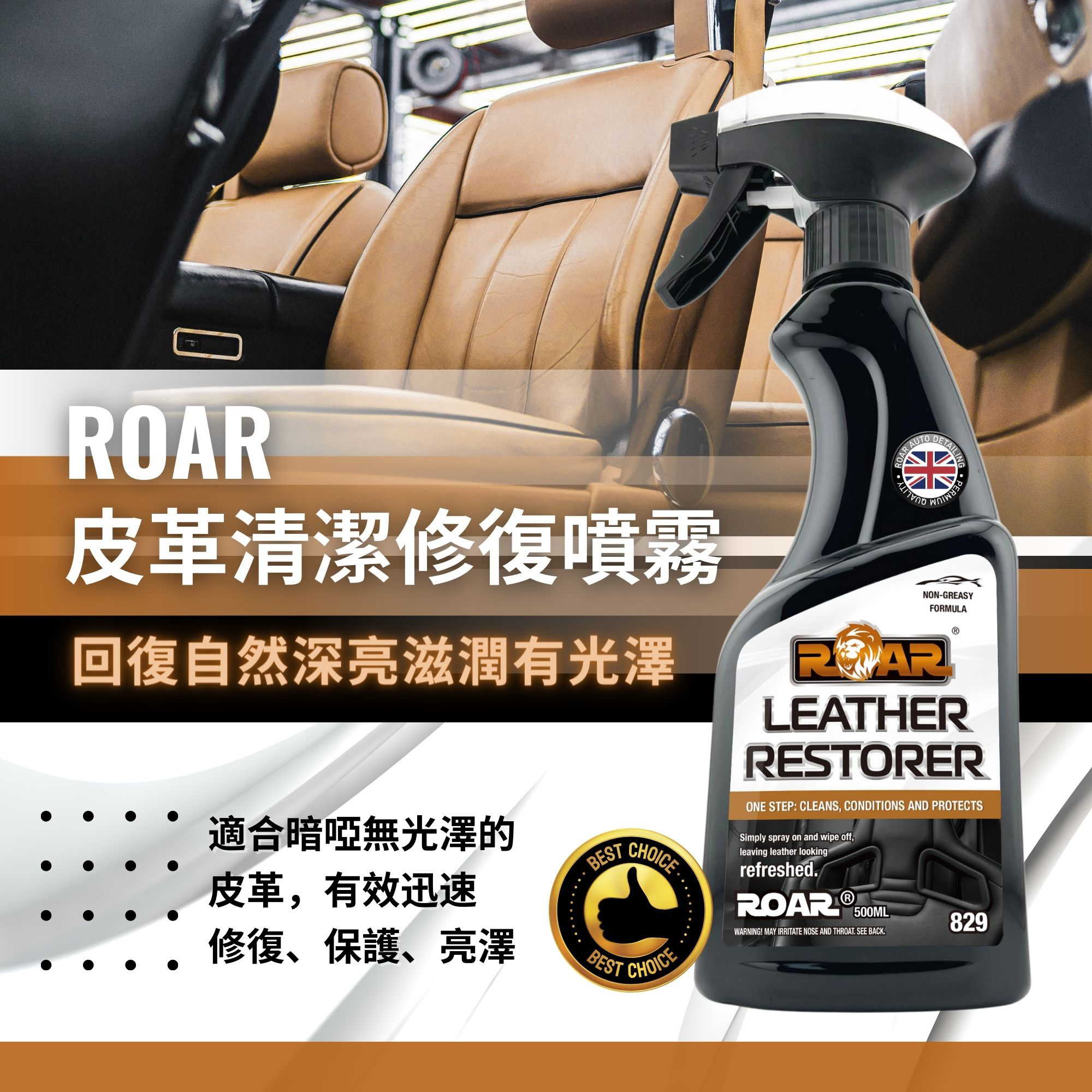 | 汽車皮座椅 响正常情況下,一般都可以使用5-8年以上,使用年期嘅長短在於有無定期進行清潔同護理。人體每天接觸皮座椅,容易沾上汗水、油脂、灰塵同污漬。陽光暴晒,皮質容易發硬或者龜裂,正確嘅保養格外重要。推薦使用 🇬🇧 ROAR 皮革清潔修復噴霧! |