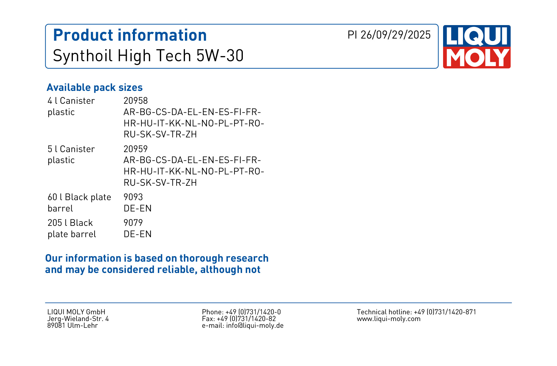 LIQUI MOLY Synthoil High Tech 5W-30 機油/潤滑油/偈油【原裝行貨】