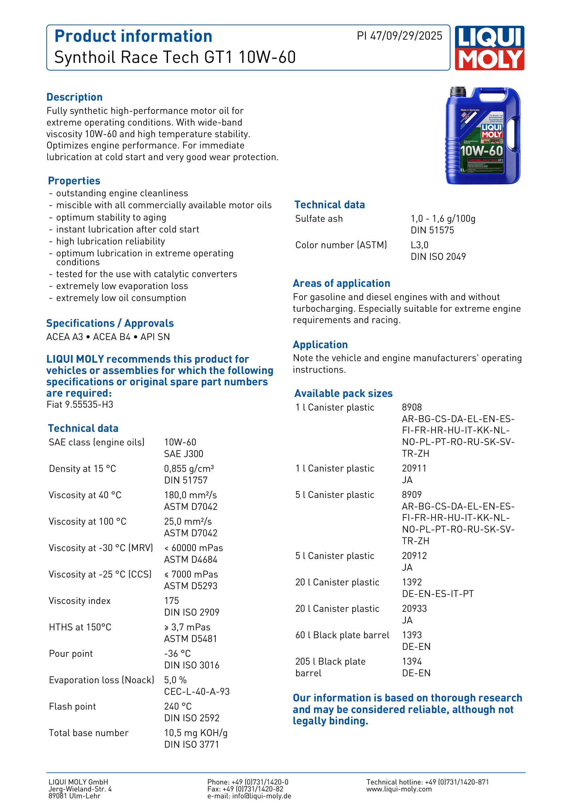 LIQUI MOLY Synthoil RaceTech GT1 10W-60 機油/潤滑油/偈油【原裝行貨】